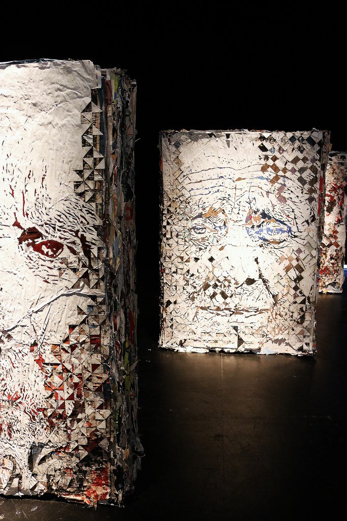 Cũng với cách sắp đặt thú vị này, nó đã tìm được những họ hàng thất lạc của những “quân domino” kia. Nơi tìm thấy chính là một triển lãm mang tên Imprint tại Bắc Kinh năm 2017. Những người họ hàng này không được tạo nên từ vô số lớp posters nữa mà từ những bức tường thạch cao có khung kim loại.