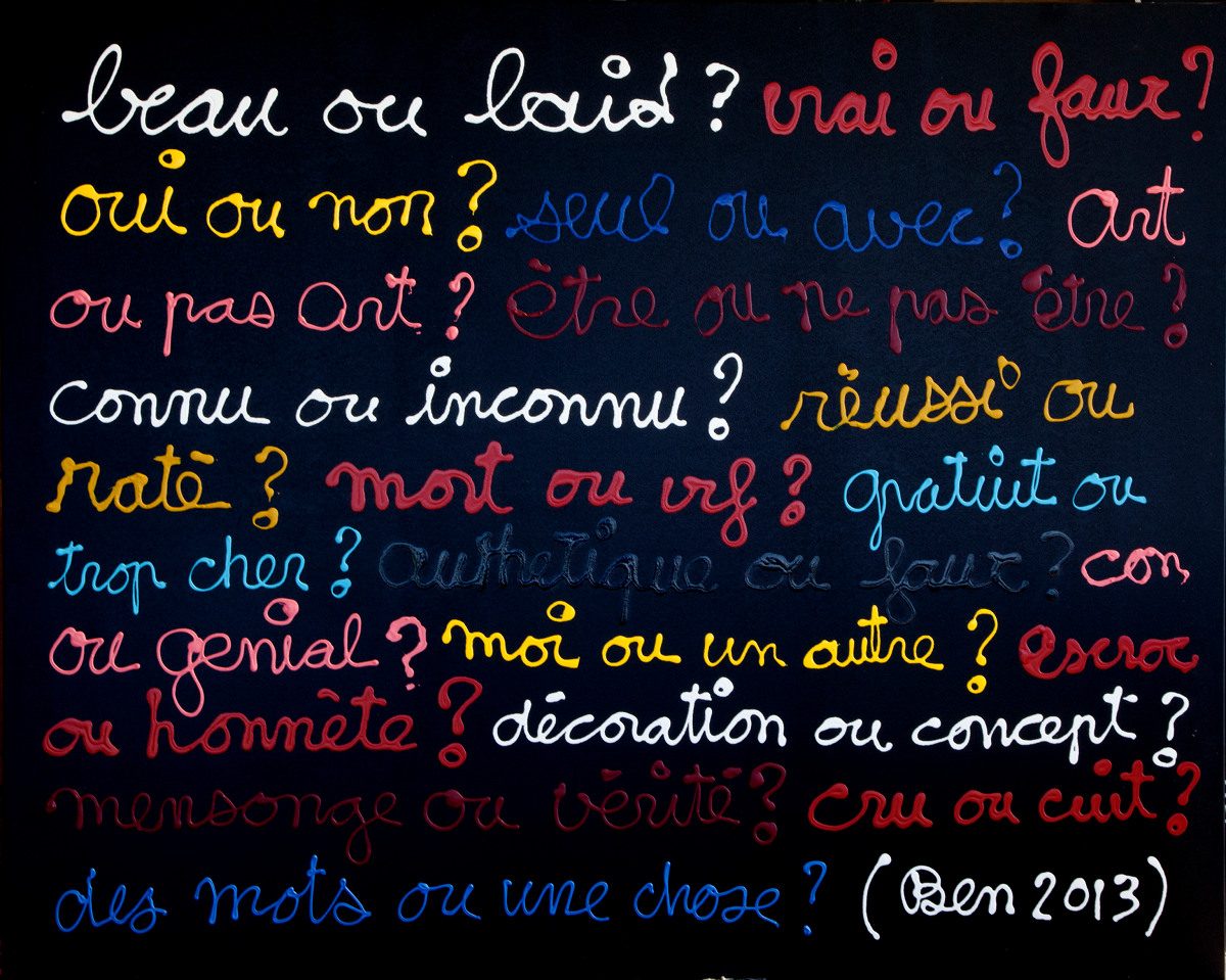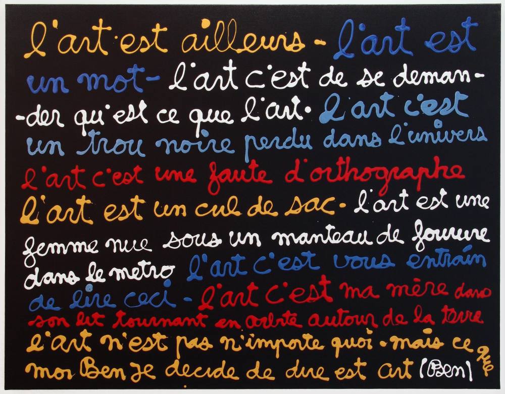 Nó nhớ tác phẩm đầu tiên khiến nó “rung động”. Một tác phẩm mà nó đã vô tình bắt gặp ở Centre Pompidou khoảng hai năm trước. Điều kì lạ là đây rõ ràng không phải một tác phẩm có thể tạo cảm giác thỏa mãn về phần hình cho người xem ngay lập tức. Mà không, thực ra với nó thì có, chỉ là tác phẩm này đẹp theo một cách khác, một vẻ đẹp toát ra từ bên trong, của tinh thần và trí tuệ. Nó thích nét đẹp cũ kĩ và thân thuộc ấy, một cửa hàng tạp hóa nho nhỏ có phần chật chội với chằng chịt những đắn đo suy nghĩ về cuộc đời và về nghệ thuật với cái tên “Le Magasin de Ben” (cửa hàng của Ben). Ben ở đây chính là tác giả, nghệ sĩ Ben Vautier, người đã tham gia vào phong trào Fluxus, nhằm nhấn mạnh mối tương quan giữa nghệ thuật và cuộc sống.