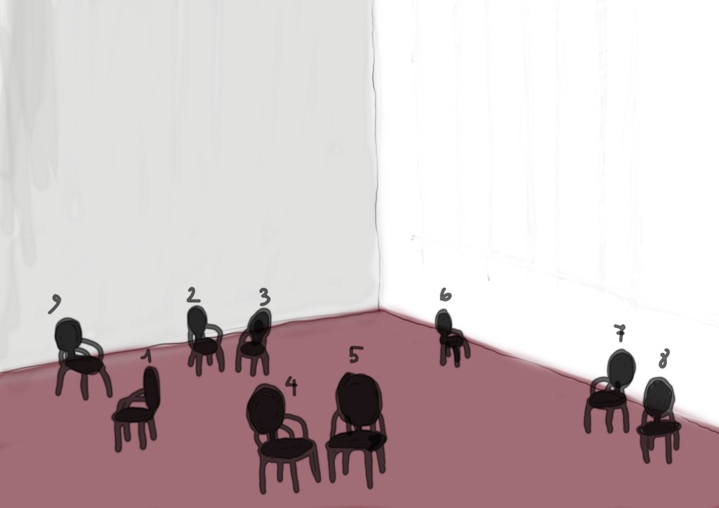 3 nhịp tiếp theo, một bạn gái từ ngoài bước vào, ngồi lên chiếc ghế còn trống bên tay trái và lấy điện thoại ra gọi videocall. Cùng lúc đó, hai thanh niên ngồi chính giữa cầm tập tài liệu lên sắp lại cho ngăn nắp bằng 2 nhịp đập lên bàn.