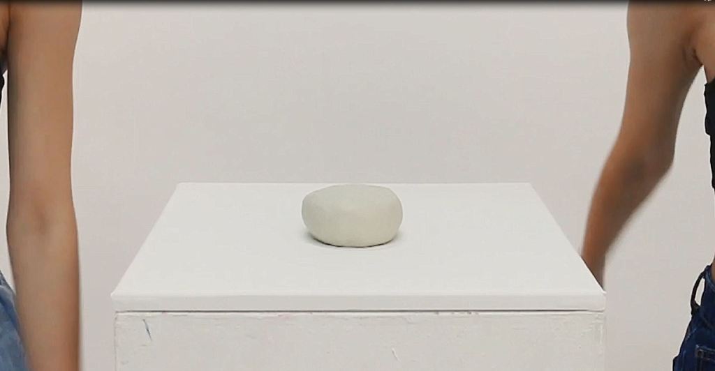Trình diễn được thực hiện bởi hai người, mỗi người đứng sát về một phía của khung hình. Ở chính giữa, nó đặt một cục đất tròn xoe màu trắng, trên một chiếc canvas 40x40cm màu trắng, và trên một chiếc bục cao ngang thắt lưng cũng màu trắng. Tiếp theo, để biết nó đã bày trò gì từ những thứ này, thì hãy cùng nó xem chiếc video này nhé!