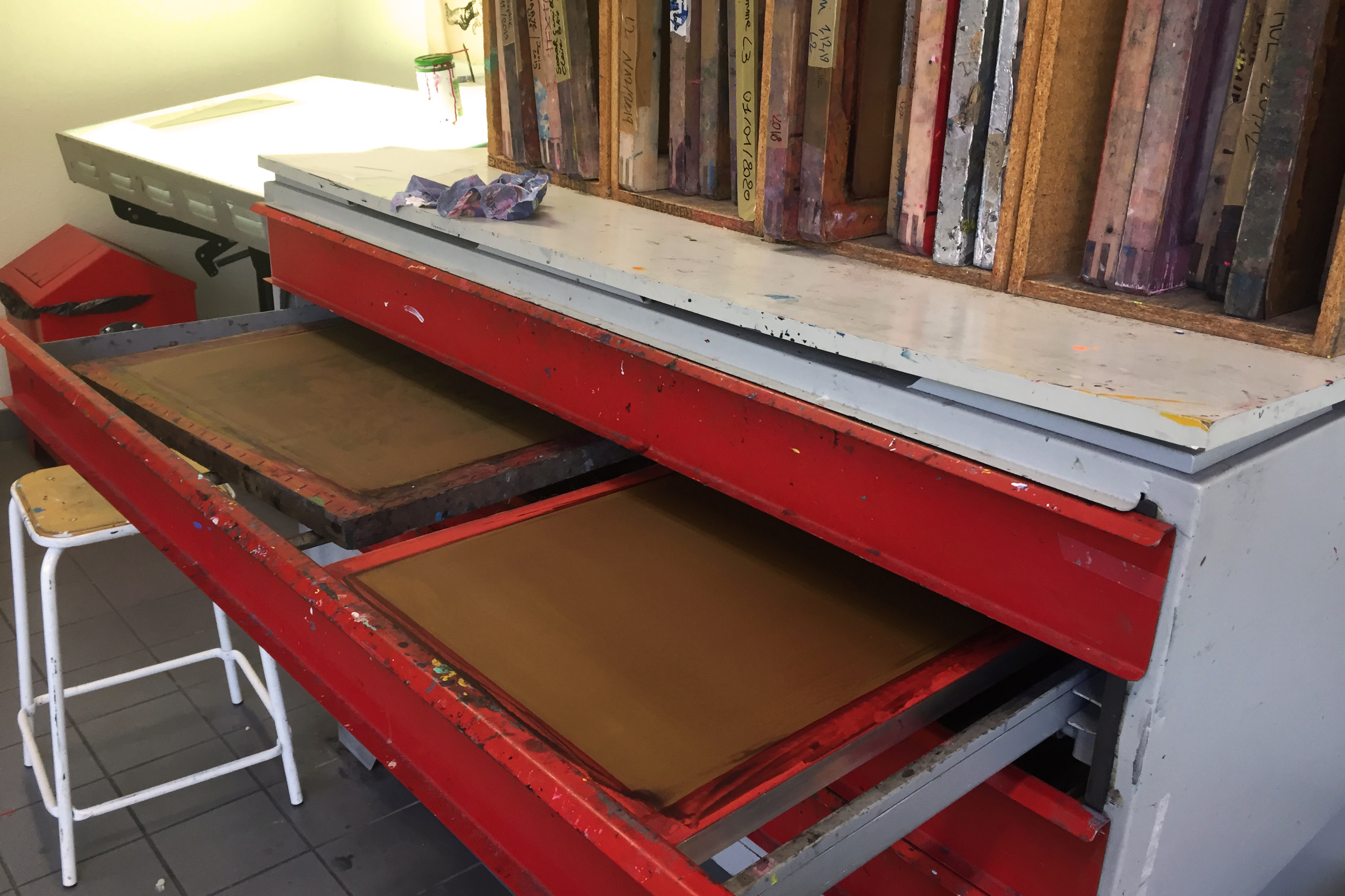 Đến ngày hôm sau thì việc đầu tiên chúng nó phải làm đó là chọn ra 10 họa tiết ưng nhất để mang đi in lên giấy trong suốt, khổ A3. Cái này tiếng pháp gọi là typon, tiếng việt có lẽ là phim (giống như phim máy ảnh vậy đó). Tấm phim này sau đó sẽ được ép lên khuôn in, đặt trong buồng tối và rọi đèn. Ánh sáng từ đèn sẽ làm phần keo, không bị che bởi mực trên tấm phim, đóng rắn lại. Phần còn lại không bị chiếu sáng sẽ dễ dàng bị rửa trôi đi với nước tạo thành những khoảng trống để mực lọt qua, bám lên giấy tạo thành bản in.