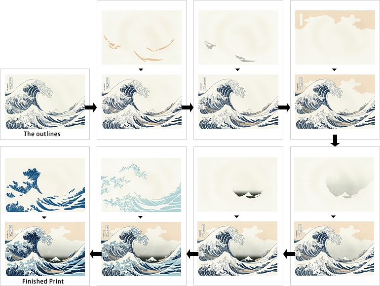 Có một điều đặc biệt là để tạo ra một bản in màu hoàn chỉnh, cần có nhiều hơn một bản khắc gỗ. Mỗi bản khắc sẽ tương ứng với một màu trên tranh. Nghệ sẽ là người đánh dấu những mảng màu và lựa chọn màu sắc. Sau đó người thợ khắc sẽ tạo ra một bộ các bản khắc gỗ tương ứng với số lượng màu sử dụng. Khi nhìn thật gần vào từng bản in, mọi người sẽ thấy những đường chạm khắc thủ công và lực miết của người in tạo nên đường nét độc nhất trên bề mặt giấy. Các tác phẩm của Hokusai nói riêng và ukiyo-e nói chung cho chúng ta thấy rằng phía sau sự đơn giản là cả một quá trình phức tạp và tinh vi.
